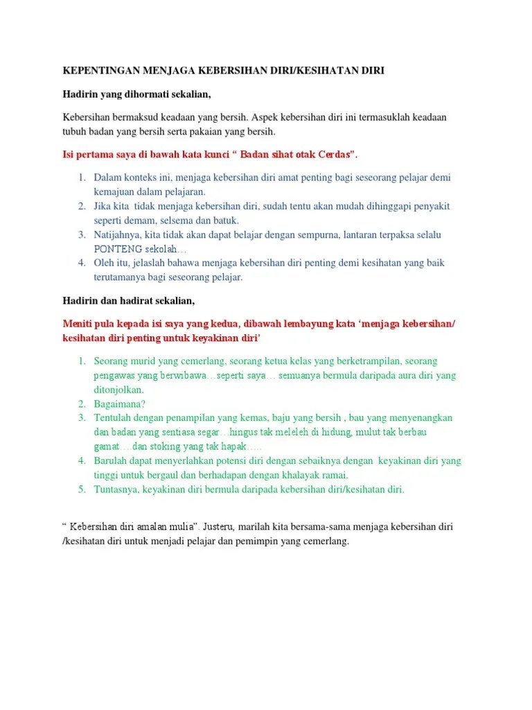 Terdapat dua contoh karangan yang dikongsikan dibawah ini untuk . Menjaga kesihatan diri ulasan penjagaan kesihatan . Keluarga boleh memainkan peranan dalam memupuk amalan kebersihan diri dan tempat tinggal.
